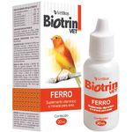 Biotrin - Ferro é um suplemento vitamínico e mineral para ser misturado à água de bebida, indicado para todas as aves domésticas e silvestres, em todos os casos em que seja necessária a suplementação de Ferro, Nicotinamida, Ácido Pantotênico e Vitaminas do Complexo B. Auxilia na muda de penas, na melhora do canto e proporciona um maior embelezamento da plumagem das aves.
