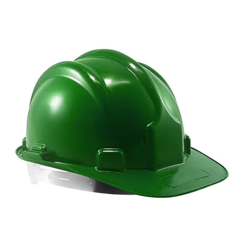 Capacete de segurança com casco injetado em polietileno de alta densidade, suspensão de 6 pontos (carneira e aranha injetadas em polietileno de baixa densidade), com tira absorvente de suor em TNT dublado com espuma e jugular opcional confeccionada em PVC. Produto certificado pelo INMETRO.