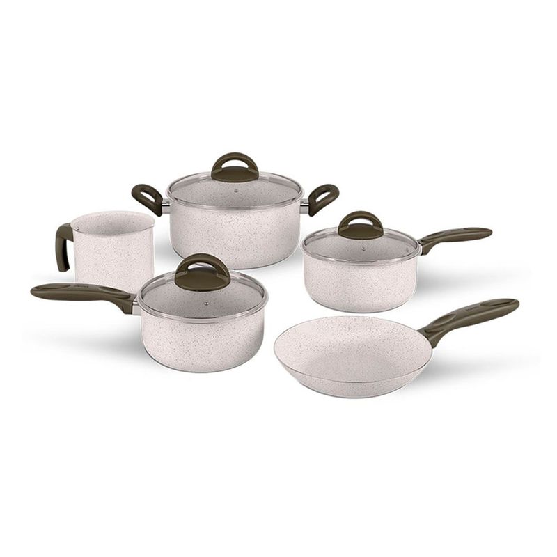 O Jogo de Panelas Brinox Antiaderente Ceramic Life 5 Peças Suprema Vanilla tem estrutura de alumínio que distribui o calor de forma homogênea. O revestimento cerâmico antiaderente conta com a tecnologia Mineral Resist, que não deixa o alimento grudar e facilita a limpeza. As tampas de vidro temperado têm saída para o vapor. Os cabos, alças e poméis são feitos em baquelite 50% regenerado e garantem o manuseio com segurança. Fabricado no Brasil com fontes de energia 100% renováveis.