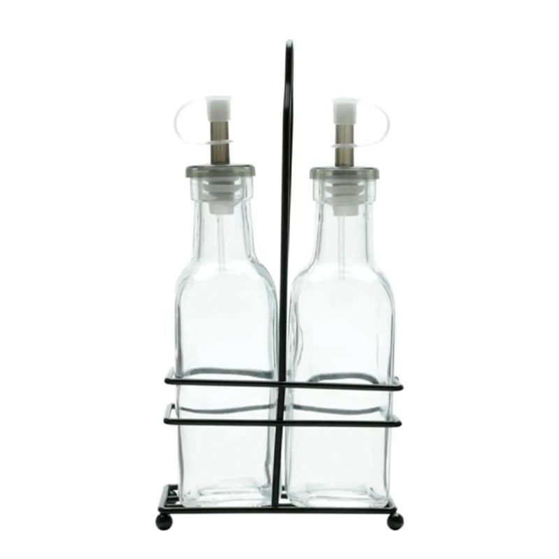 Este conjunto galheteiro é perfeito para armazenar azeite e vinagre. Com capacidade de 200 ml cada e suporte de metal preto, ele combina praticidade e design contemporâneo.