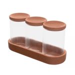 Adote a essência da organização e estilo na sua cozinha com o Conjunto 3 Porta Mantimentos de Vidro Borossilicato com Tampa Rolha e Suporte Essência 500ml da Lyor.