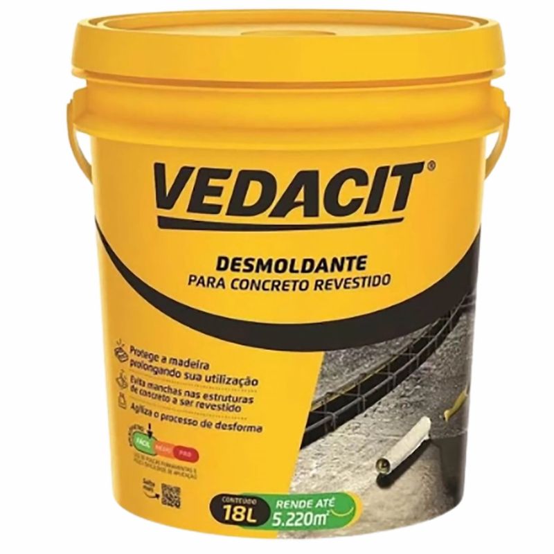 VEDACIT DESMOLDANTE para concreto revestido forma uma fina camada entre o concreto e as fôrmas, impedindo a aderência entre ambos e possibilitando grande reaproveitamento das fôrmas. Facilita a limpeza e a remoção sem danificar nem manchar as superfícies e arestas do concreto. É especialmente indicado para concreto a ser revestido. Pode ser utilizado em fôrmas de madeira e compensados comuns ou resinados. Não mancha o concreto, não é inflamável nem agressivo à pele.