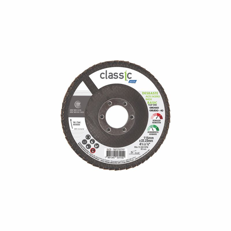 O Disco Flap Classic Basic desbasta e da acabamento ao mesmo tempo, eliminando a troca de discos em trabalhos que exijam as duas operações. É utilizado em lixadeiras e esmerilhadeiras angulares para desbaste de soldas, rebarbação, eliminação de pontos de corrosão, entre outros, em aço inoxidável, metais ferrosos e não-ferrosos.