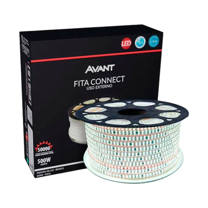 Projetada para iluminações que requerem maior clareza, a Fita LED Connect IP65 de 50 metros da Avant possui potência de 10W por metro e temperatura de cor de 6500K (branco frio). Com 120 LEDs por metro, proporciona alta luminosidade. O índice de proteção IP65 assegura resistência contra água e poeira, sendo adequada para ambientes externos. A conexão direta à rede elétrica de 220V facilita a instalação, eliminando a necessidade de driver. Esta fita também é dimerizável, permitindo controle da intensidade da luz conforme desejado.
