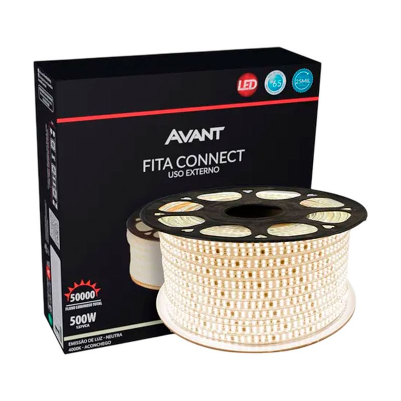 A Fita LED Connect IP65 de 50 metros da Avant, com potência de 10W por metro e temperatura de cor de 4000K (branco neutro), é versátil para diversas aplicações, oferecendo equilíbrio entre tons quentes e frios. Equipada com 120 LEDs por metro, garante iluminação eficiente e homogênea. O índice de proteção IP65 permite seu uso em áreas externas, resistindo a intempéries. A instalação é prática, com conexão direta à rede de 220V, sem necessidade de driver. Além disso, é dimerizável, possibilitando ajuste da intensidade luminosa conforme a necessidade do ambiente.