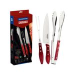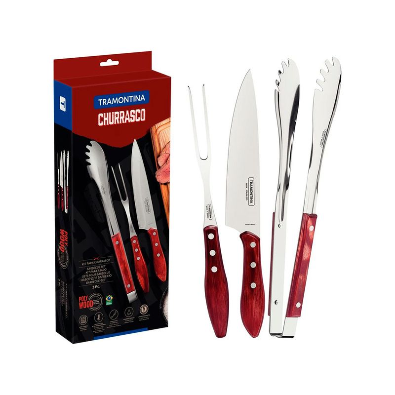 Todo churrasco precisa de utensílios que possibilitem um preparo de qualidade e torne o momento de servir ainda mais prático. Com o jogo para churrasco Tramontina com lâminas em aço inox com cabo de madeira tratada polywood vermelho 3 peças você contará com os utensílios que todo bom churrasqueiro precisa ter. O jogo é produzido com lâminas em aço inox, a faca recebe que oferece um excelente corte, o material é altamente durável. Possui um belíssimo cabo de madeira tratada Polywood que resiste à impactos e altas temperaturas, e traz a beleza da linha Churrasco para conquistar a admiração de todos.