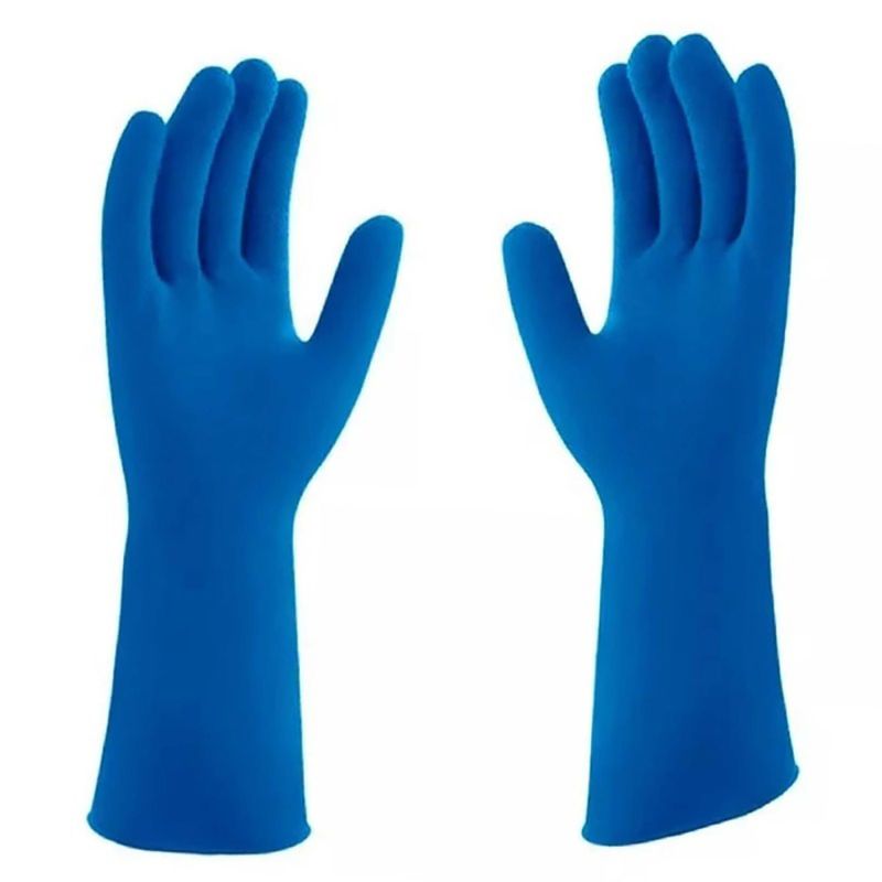 Luva confeccionada em látex natural, com revestimento interno em flocos de algodão, face palmar e ponta dos dedos antiderrapante.