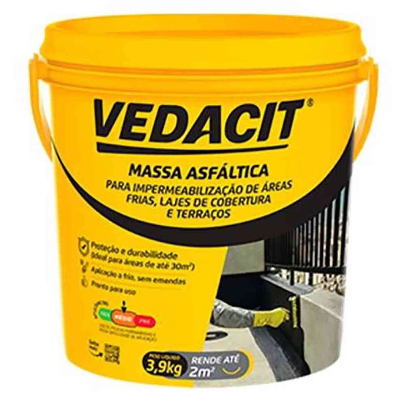 VEDACIT MASSA ASFÁLTICA* para impermeabilização de áreas frias, lajes de coberturas e terraços é uma massa betuminosa que forma uma camada impermeável, de grande resistência química e aplicação a frio sem emendas. Está pronta para uso e é moldada no local.É aplicado como pintura, com trincha ou vassoura de cerdas macias, em demãos, respeitando o consumo por m², com intervalo mínimo de 6 horas entre cada demão, à temperatura de 25 °C.