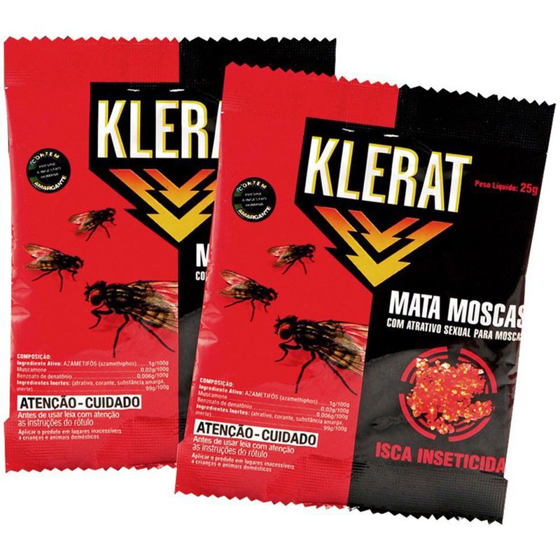KLERAT MATA MOSCAS são iscas granuladas de alta atratividade para o combate de moscas domésticas. O produto age rapidamente e tem sua aplicação recomendada quando houver a presença destes insetos, atuando de forma eficiente assim que a mosca entra em contato com o produto.