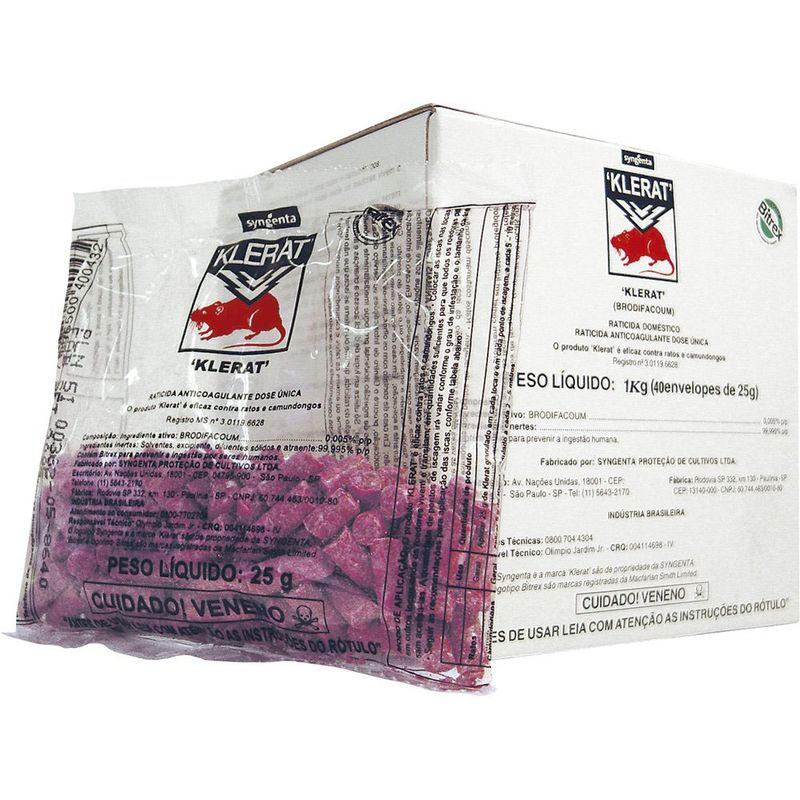 É um raticida indicado para controlar altas infestações. Seu modo de ação não causa desconfiança nos demais roedores da colônia, fazendo com que continuem a consumir as iscas. A apresentação KLERAT MATA RATOS ISCA GRANULADA é indicada para uso em locais internos e secos.