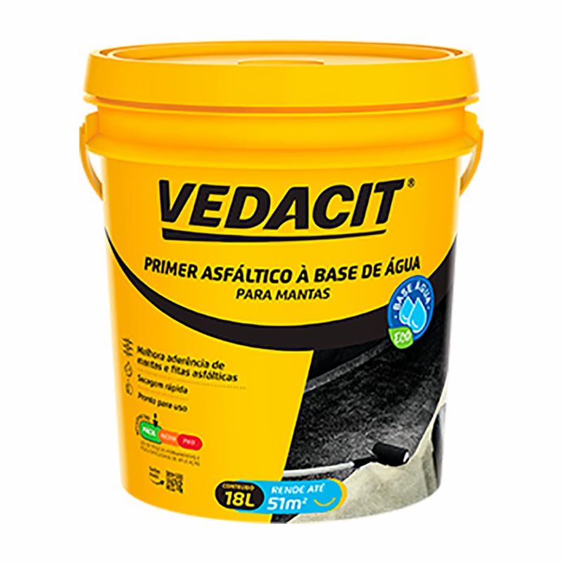VEDACIT PRIMER ASFÁLTICO À BASE DE ÁGUA* para mantas é uma emulsão asfáltica indicada para imprimação de superfícies de concreto ou argamassa para colagem de mantas asfálticas e fitas autoadesivas. Apresenta secagem rápida e alto poder de aderência, mesmo sobre superfícies úmidas. Por apresentar baixo teor de COV, ajuda a reduzir a quantidade de contaminantes do ar, contribuindo para a preservação do meio ambiente.