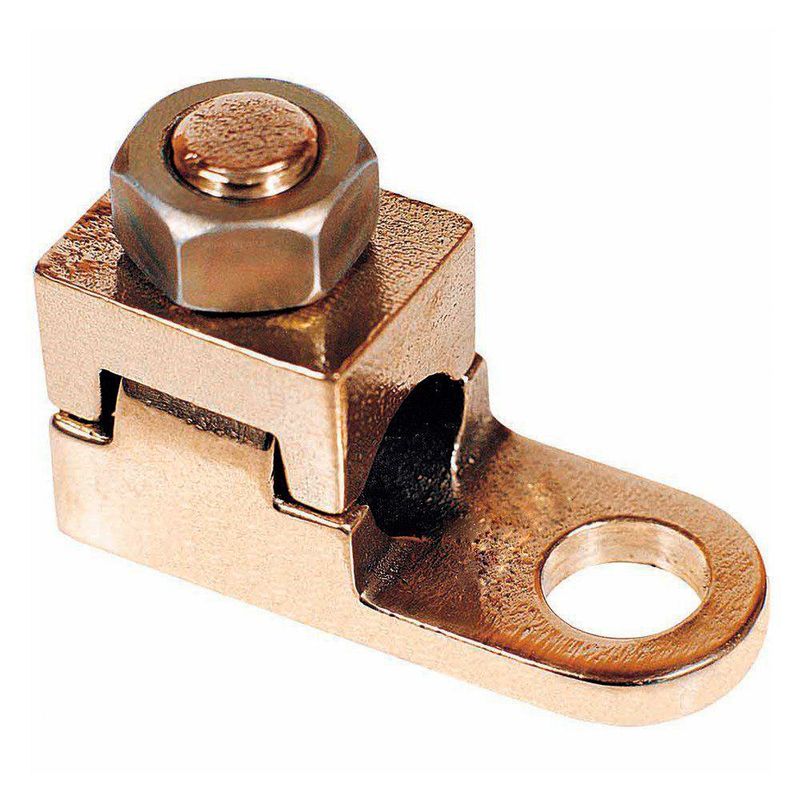 Características: Conexão por aperto/pressão. Sapata com um furo. Aplicação: Instalações elétricas em geral (residencial, predial, industrial). Material: Terminal em liga de cobre, porca em aço zincado eletrolítico. Ferramentas de Aplicação: Chave estrela ou fixa