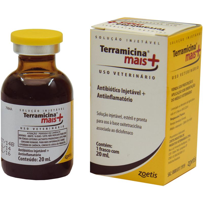 O Terramicina Mais 20ml é uma solução injetável, estéril e pronta para uso à base oxitetraciclina associada ao diclofenaco.